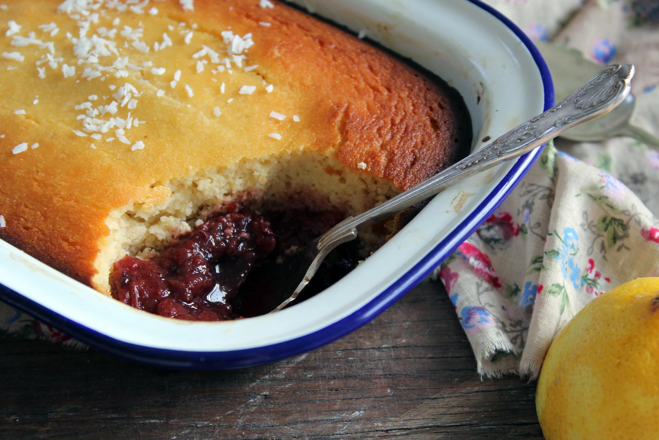 This pudding comes together really quickly. It's incredibly easy and could be adapted to suit what ever cooked fruit you had on hand. It's gluten, grain and dairy free - though I'd definitely endorse enjoying this with some good quality cream if you're so inclined. x