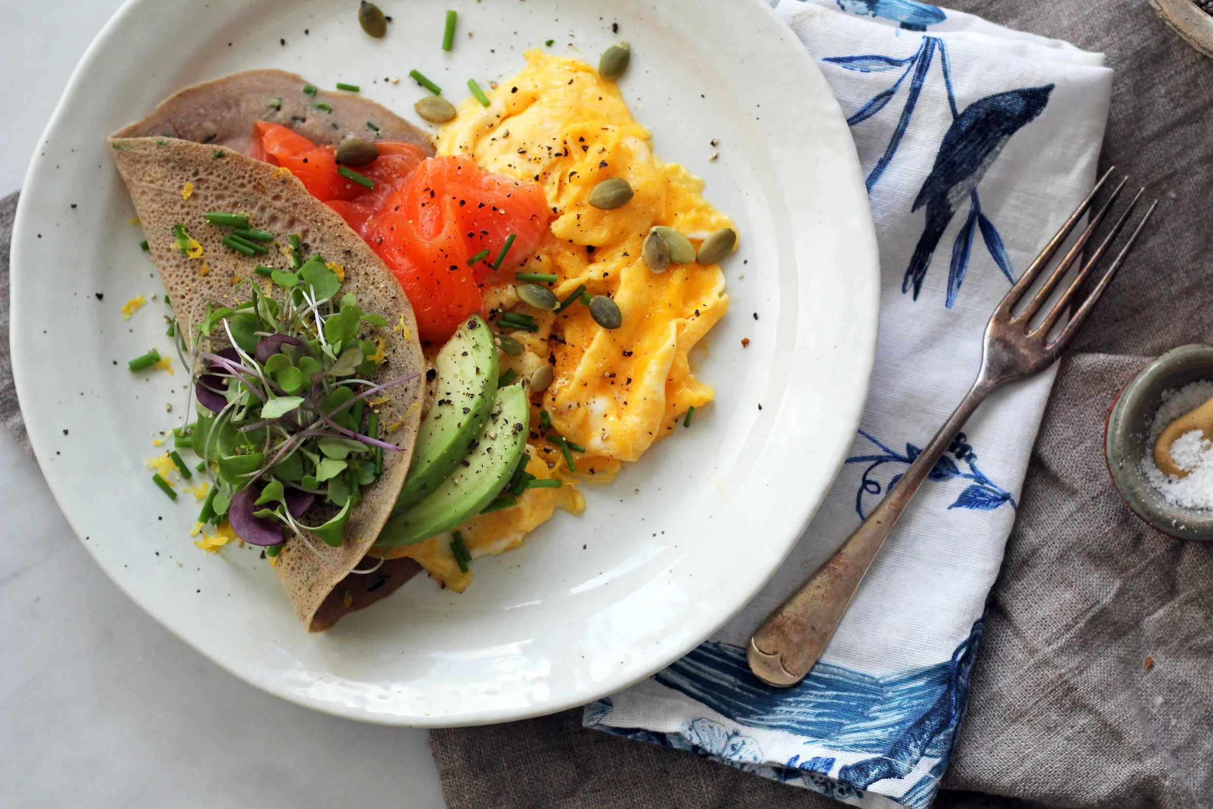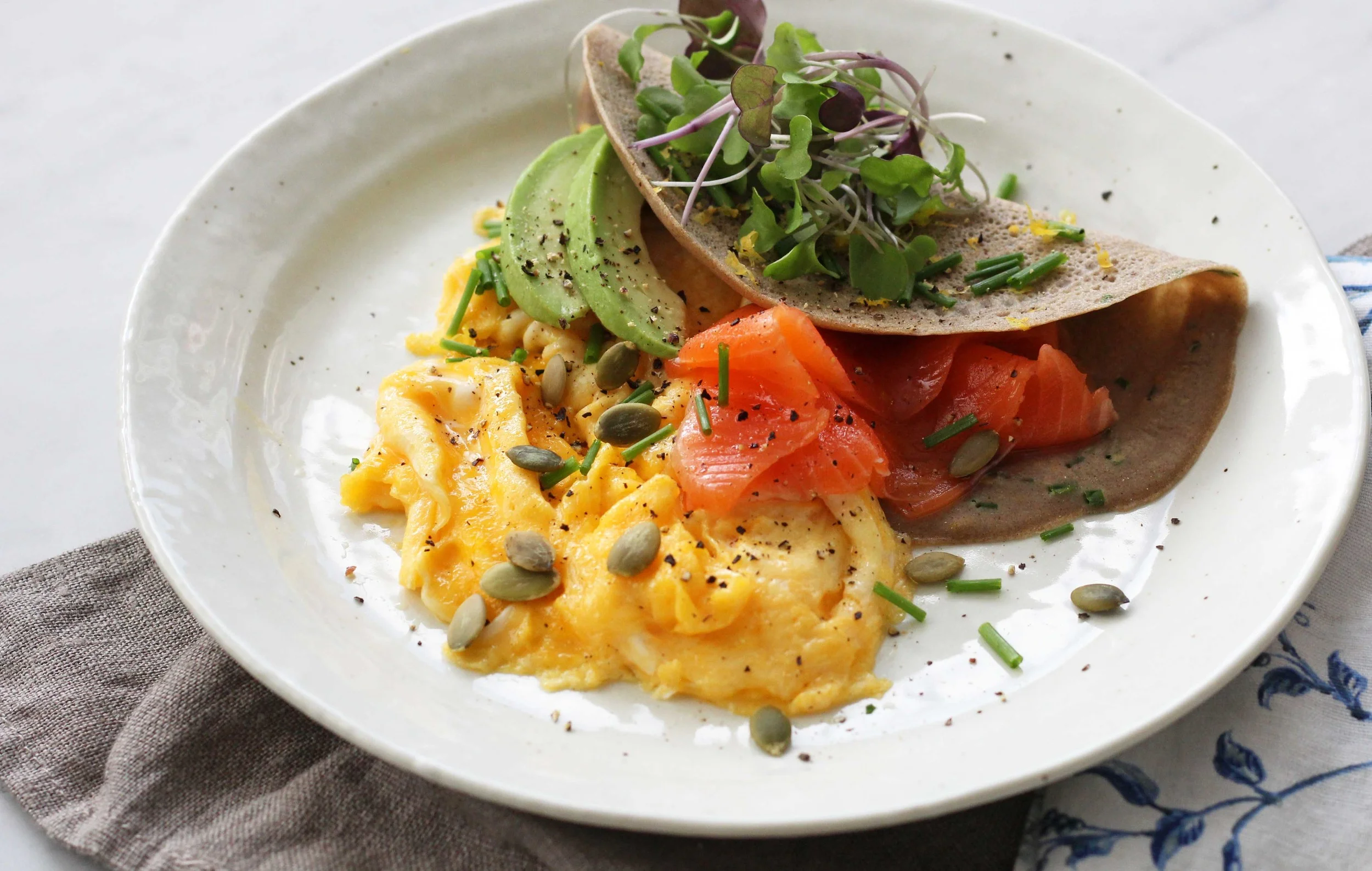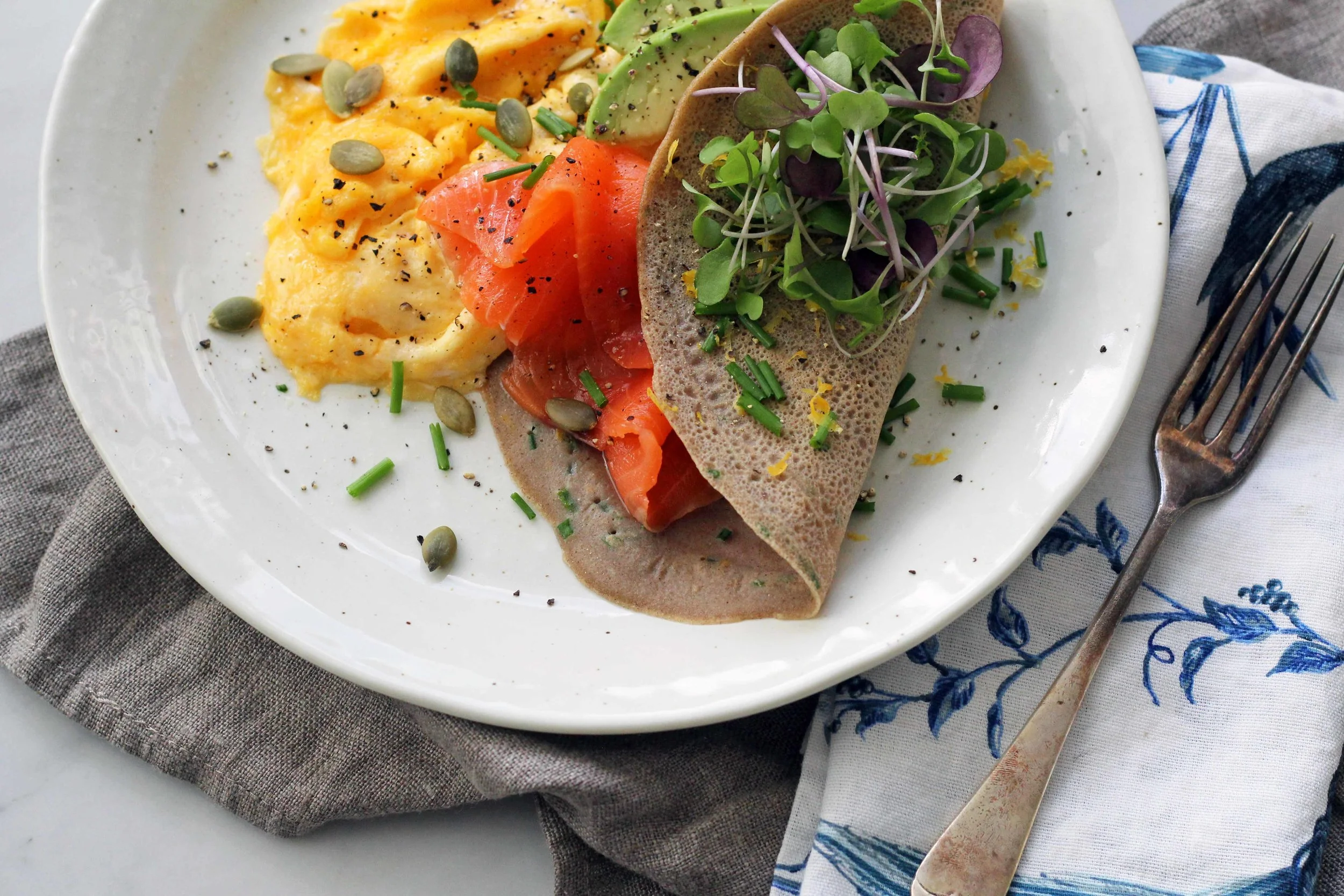 Lemon & chive buckwheat crepes w/ silky scrambled eggs & smoked salmon